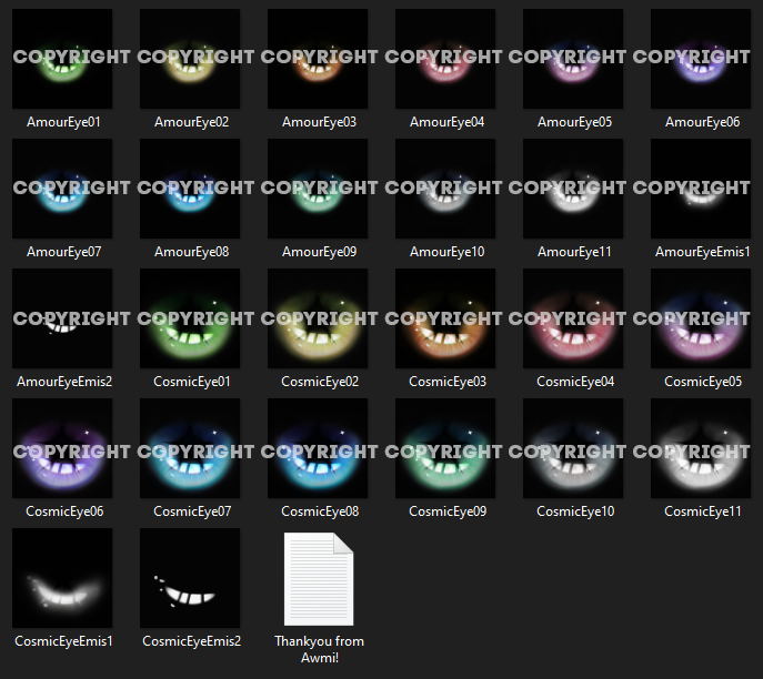 +Β 22 eye textures (11 for amour head & 11 for amelia/other heads), + Varying detailed emission masks